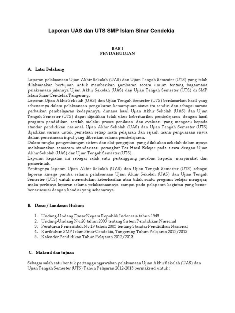 Contoh Laporan UAS SD SMP SMA Format Word Laporan PertanggungJawaban LPJ adalah suatu dokumen tertulis yang disusun dengan tujuan memberikan laporan tentang pelaksanaan kegiatan Ujian Akhir Semester UAS dari suatu instansi sekolah kepada instansi yang lebih tinggi atau sederajat. Rencana Kerja Jangka Menengah RKJMRKS. LAPORAN PELAKSANAAN bab 1 - penutup.